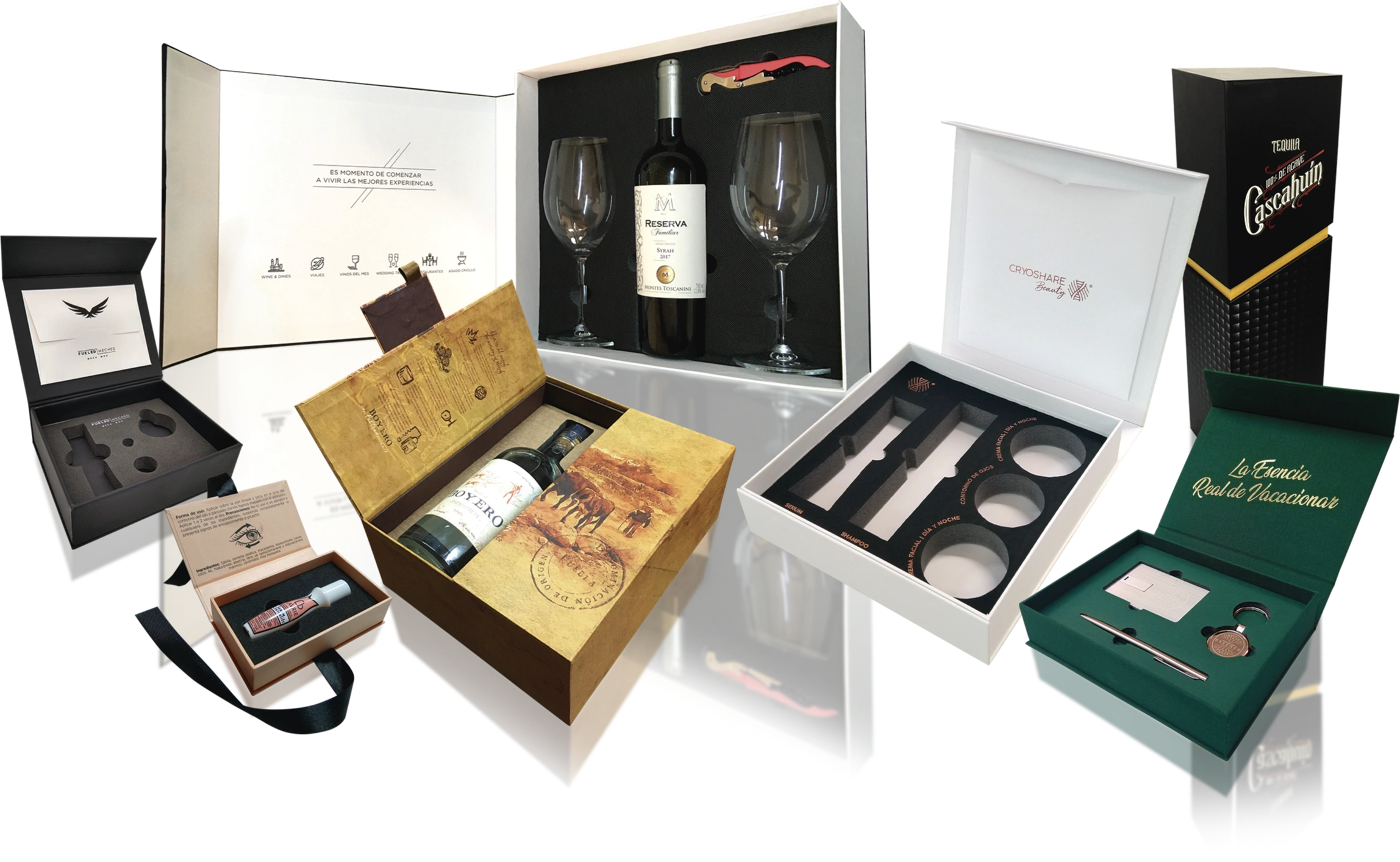 Estuches para botellas de Tequila, Mezcal, Vinos, cosméticos, perfumes, chocolates, telefonía, electrónicos, joyería, kits de bienvenida y muchos más.